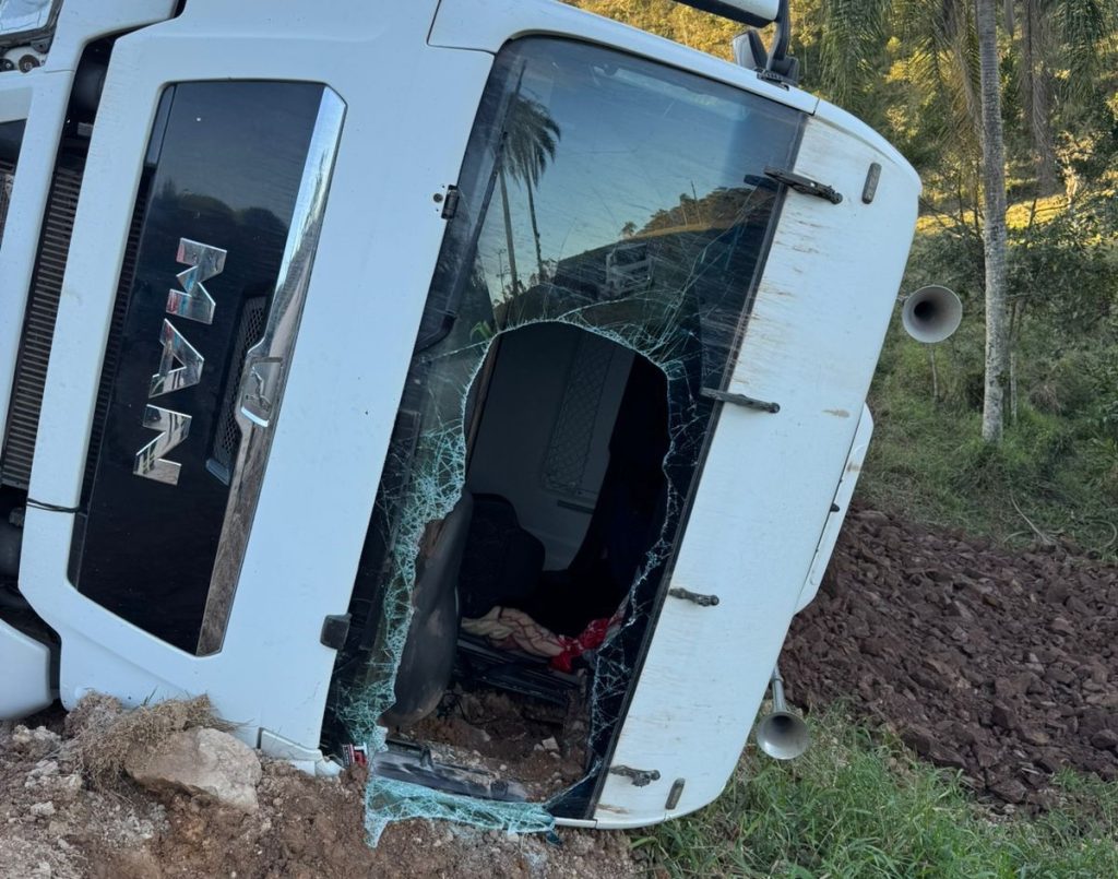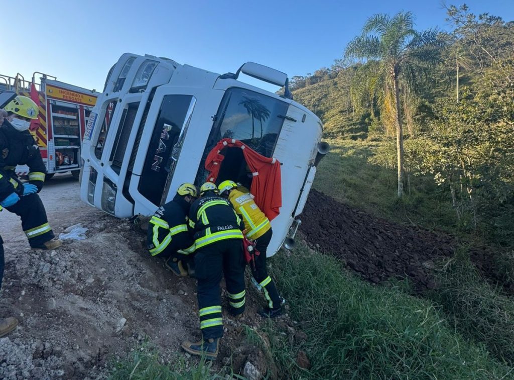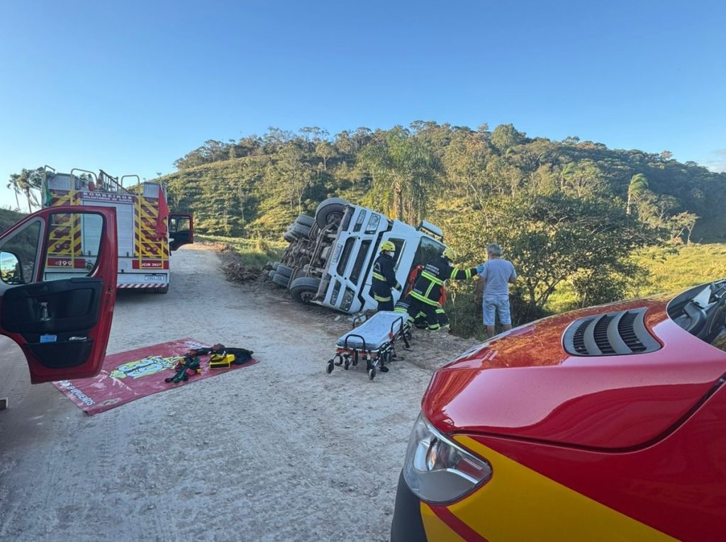 Bombeiros de Ilhota e Gaspar atendem capotamento de caminhão na Estrada Geral Pocinho, motorista teve ferimentos leves