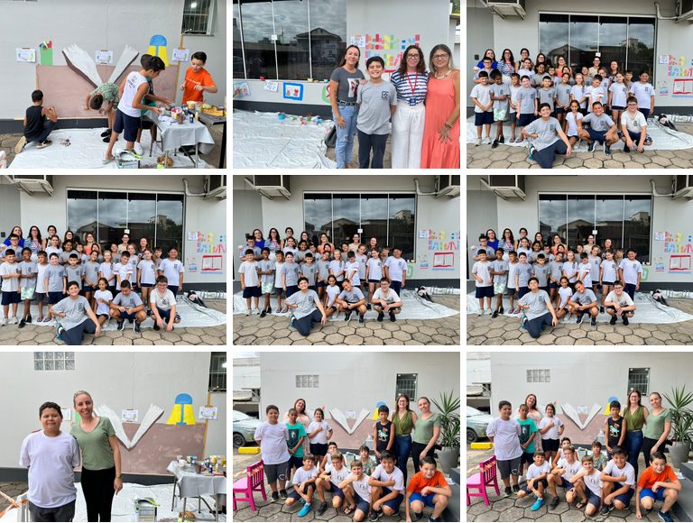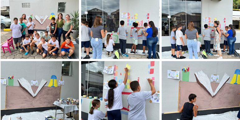 Os três desenhos que foram selecionados para a fachada do prédio, a turma toda veio fazer a pintura, com a orientação da artista Bárbara Planca. Os vencedores foram Gustavo Dias Proencio, do 4º ano da EEB Professor Vitório Anacleto Cardoso, com o desenho “Feliz Aniversário”; Maria Valentina Rodrigues Alves, do 4º ano da EEB Olímpio Moretto, com o desenho “Lendo um livro”; e João Victor de Lara Francioni, da EEB Mário Pederneiras, com o desenho “Viva o mundo da Leitura”.