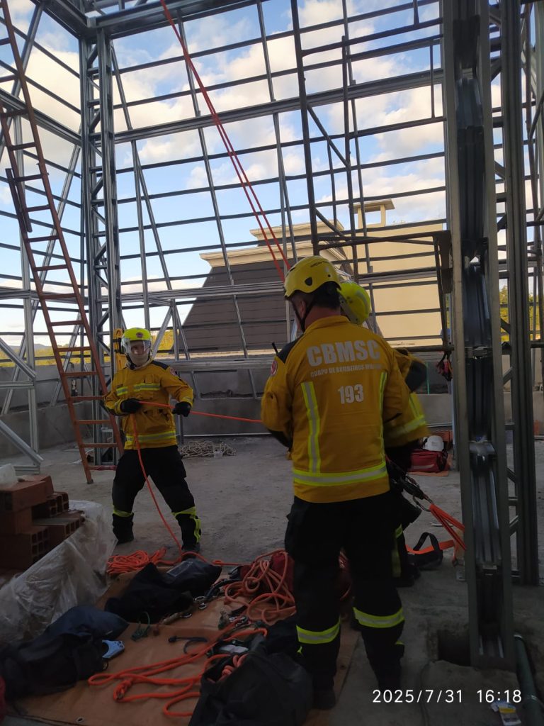 Ao chegar no local, a equipe de resgate encontrou o funcionário da obra, aguardando o socorro, o mesmo estava colocando as treliças de metal do telhado do edifício em obras, quando veio a torcer o joelho direito, causando luxação da patela, como estava usando devidamente seu EPI, com o talabarte preso na estrutura, não sofreu a queda e estava consciente e orientado, com os sinais vitais estáveis. Antes da chegada do socorro, os demais funcionários improvisaram uma tala para imobilizar o membro afetado e aguardaram com o paciente até a chegada da guarnição.